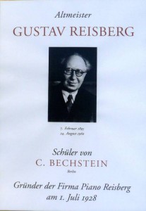 Gustav Reisberg gründete am 01.07.1928 die Firma Piano Reisberg. Er erwarb sein Wissen bei der Firma C. Bechstein in Berlin. Zu dieser Zeit gab es den heutigen Meistertitel noch nicht. Somit wurde Gustav Reisberg sogenannter „Altmeister“. Er war langjähriger Konzertstimmer von Wilhelm Furtwängler, Dirigent und Komponist in Berlin und Leiter der Berliner Staatsoper von 1921-1927.