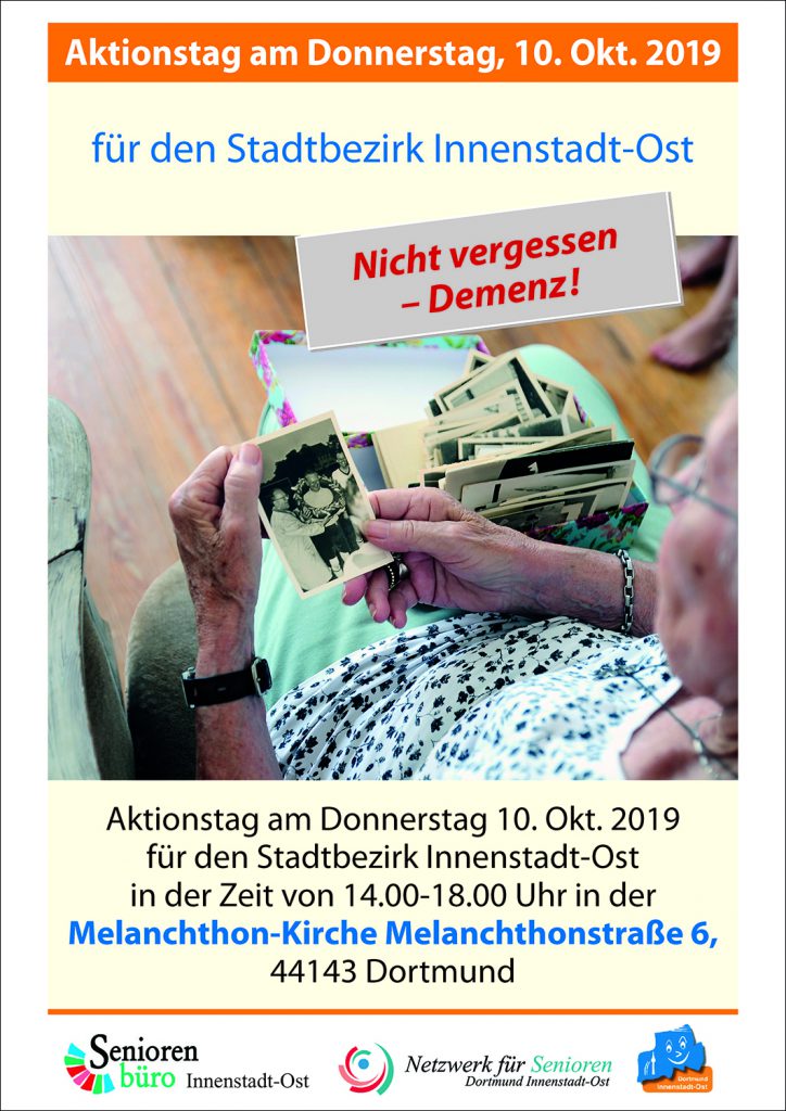 Das Seniorenbüro Innenstadt-Ost lädt in Kooperation mit dem Netzwerk für Senioren am Donnerstag, den 10. Oktober in der Zeit von 14.00 bis 18.00 Uhr, alle Interessierten zum Informations- und Aktionstag unter dem Motto „Nicht vergessen – Demenz!“ in die Melanchthon – Kirche, Melanchthonstraße 6 in 44143 Dortmund, ein.