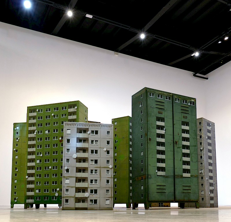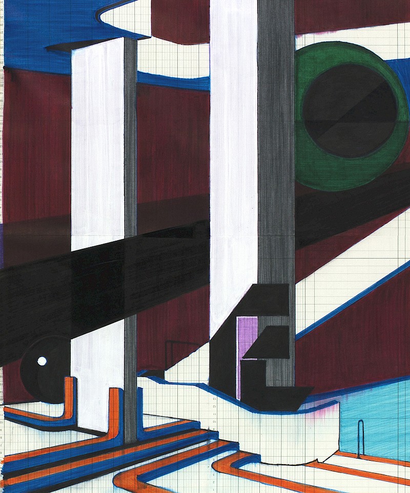 Genau gegenüber auf der anderen Straßenseite, in der Pausenhalle des ehemaligen Gymnasiums von den Architekten Groth Lehmann Schlote, zeigen die beiden Berliner Künstler Alekos Hofstetter und EVOL die Ausstellung DOPPELPLUSMODERN, die ebenfalls die Auseinandersetzung mit der Architektur der Nachkriegsmoderne zum Inhalt hat. Der Zeichner und Maler Alekos Hofstetter setzt sich in seinem 2012 begonnen Werkzyklus Tannhäuser Tor mit der stetigen Veränderung der Architektur der Epoche von 1950 bis 1980 auseinander. EVOL dagegen arbeitet mit Fundstücken aus dem öffentlichen Raum, Stromkästen, gebrauchtem Baumaterial, Betonpollern, denen er durch einfache Eingriffe eine neue Bedeutung verleiht.