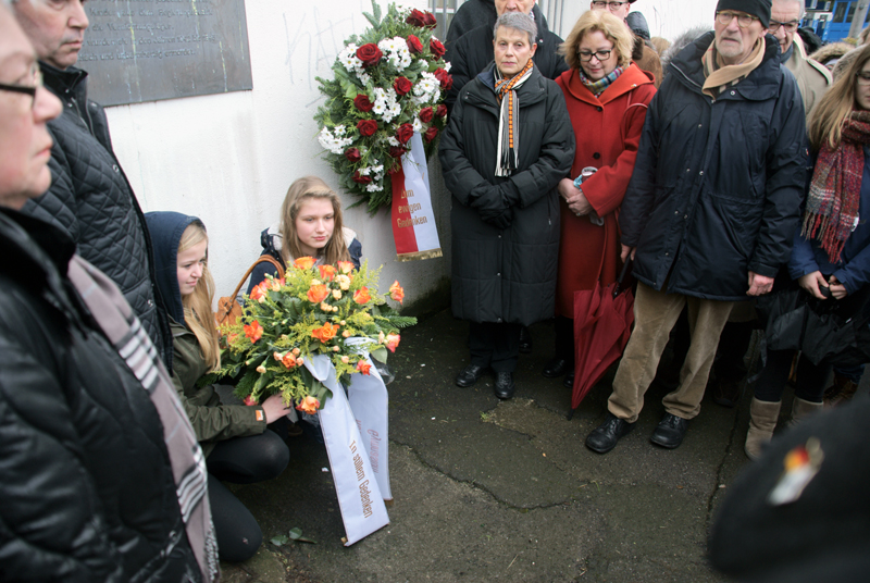 Im Stadtbezirk Innenstadt-Ost wird dieser Tag daher zum Anlass genommen, innezuhalten. Bezirksbürgermeister Udo Dammer, die Mitglieder der Bezirksvertretung Innenstadt-Ost und die Schüler des Käthe Kollwitz Gymnasiums haben an der Gedenktafel am „Wasserturm“ zum Gedenken wie zur mahnenden Erinnerung einen Kranz niedergelegt.