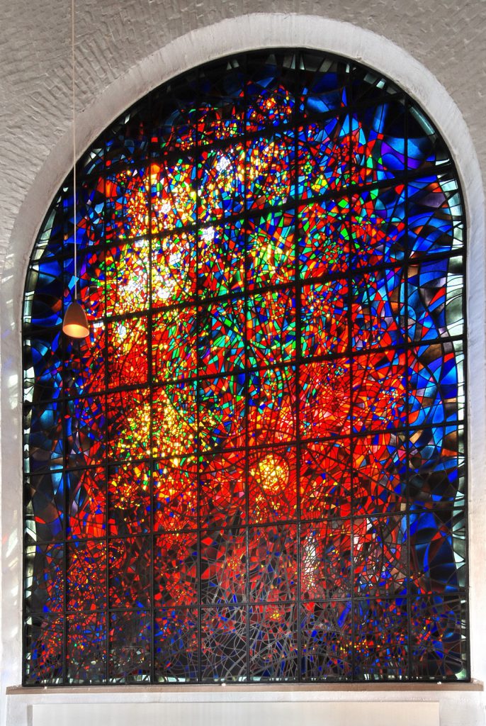 Geschaffen hat das Fenster der Künstler Hans Kaiser (1914 – 1982). Den überzeugten Pazifisten bewahrte nur eine Erkrankung vor dem Kriegsdienst während der nationalsozialistischen Diktatur. Allerdings war er in dieser Zeit von den modernen Kunstströmungen abgeschnitten. Von daher zog es ihn Anfang der 1950er Jahre immer wieder nach Paris. Im Austausch mit französischen Künstlern suchte Kaiser nach neuen Ausdrucksmöglichkeiten. Er wandte sich vor allem der sogenannten Informellen Kunst zu. Unter diesem Begriff werden verschiedene Kunstausprägungen der europäischen Malerei nach dem Zweiten Weltkrieg zusammengefasst, die auf die vollständige Abstraktion setzten. Nicht mehr ein Gegenstand sollte abgebildet oder bestimmte Formen gezeigt werden, sondern die aufgetragenen Farbflächen sollten für sich selbst und im Zusammenspiel mit anderen Farben auf den Betrachter wirken. Die geometrisch nicht geordneten Farben scheinen wie zufällig und spontan auf die Leinwand geworfen.
