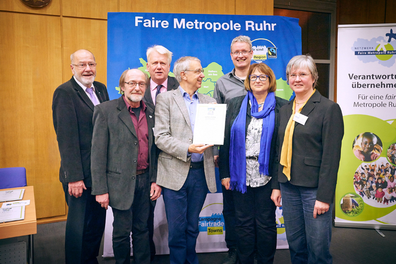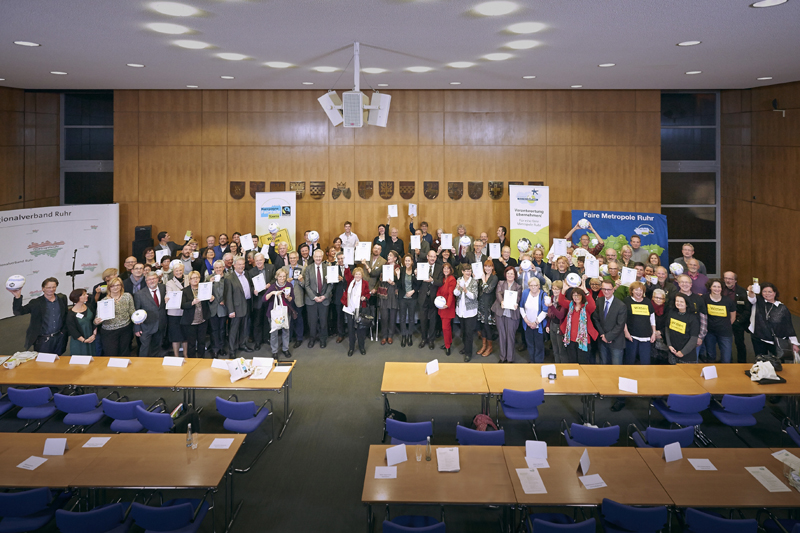 Bei der Feier der Titelerneuerung im Sitzungssaal des Ruhrparlaments beim Regionalverband Ruhr in Essen erhielten 30 Kommunen, ein Kreis, der RVR und das Netzwerk Faire Metropole Ruhr erneut ihre Auszeichnungsurkunden. Dieter Overath, Geschäftsführer von Fairtrade Deutschland lobte das besondere Engagement im Revier für Fairen Handel und weltweite Gerechtigkeit.