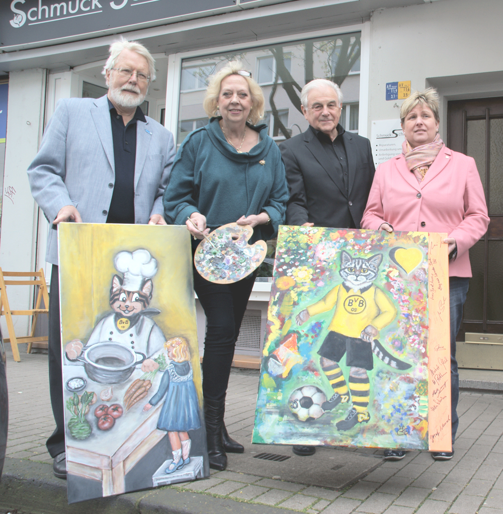Versteigert wird u. a, das BVB-Katzenbild, das 2009 anlässlich des 100-jährigen Bestehens des BVB im Kindergarten Heidegarten entstanden ist. Beteiligt waren u. a. Erich G. Fritz (Ehrenvorsitzender des CDU-Kreisverbandes Dortmund), Ines Burkhardt (Kammerschauspielerin), Uwe Samulewicz (Vorstandsvorsitzender der Sparkasse Dortmund), Dr. Frank Brandstätter (Leiter des Dortmunder Zoos), Adolf Miksch (Altbürgermeister), Jane Franklin (Sängerin im Olpketal Theater), Norbert Dickel (Stadionsprecher und Ex-Spieler von Borussia Dortmund), Joachim Pohlmann (Rechtsanwalt und Notar), Claus-Dieter Clausnitzer (Schauspieler, auch bekannt aus dem Tatort Münster), Josef Schneck (Pressesprecher Borussia Dortmund) und Dagmar Schnecke-Bend.