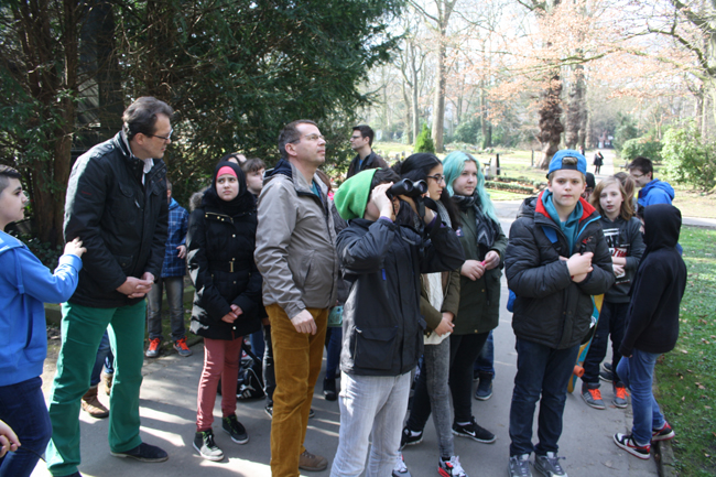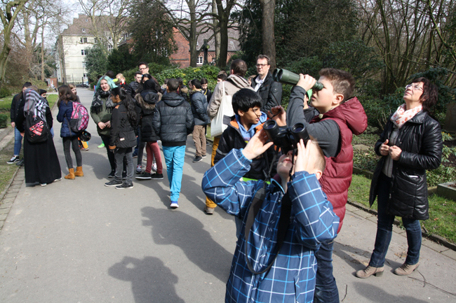 Bei einer vogelkundlichen Wanderung, ausgestattet mit Ferngläsern und entsprechenden Informationen, nahmen die mehr als 30 Jugendlichen am 17. März nunmehr die Vogelwelt optisch und akustisch näher in Augenschein. Dabei wurden sie nicht nur durch ihren Lehrer Ralf Symior, sondern auch durch Guido Bennen (NABU), Sigrid Müller (Friedhöfe Stadt Dortmund) und Hartmut Neumann vom Leitungsteam Stadtbezirksmarketing Dortmund-Innenstadt-Ost, das die Aktion ins Leben rief und finanziell fördert, begleitet.
