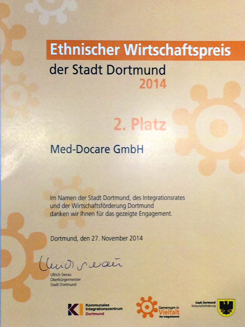 Bereits zum zweiten Mal nach 2012 vergab am 27. November 2014 die Stadt Dortmund den „Ethnischen Wirtschaftspreis“ im Dortmunder Rathaus. Der Preis wurde im Rahmen des gesamtstädtischen Integrationsprozesses „Masterplan Migration/Integration“ ins Leben gerufen und richtet sich speziell an Betriebsinhaberinnen und Betriebsinhaber mit Zuwanderungsgeschichte. Den zweiten Platz belegt die Med-Docare GmbH aus der Innenstadt Ost.