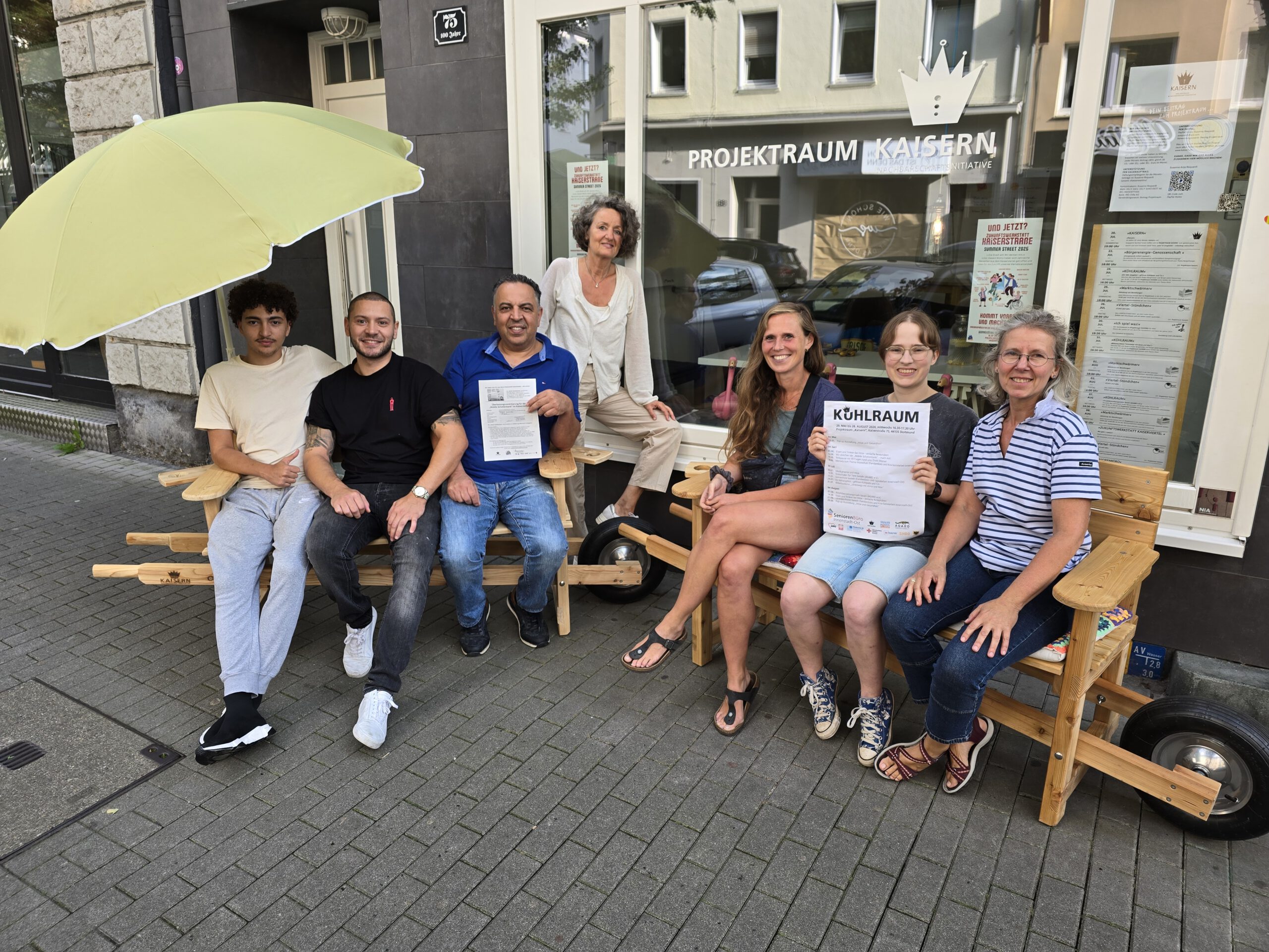 Fünf mobile Holz-Sitzbänke mit Sonnenschirm laden ab sofort zum Verweilen ein und spenden ihren Nutzer:innen Schatten auf ihrem Weg durch das Kaiserviertel. Die Bänke stehen bei der Melanchthongemeinde, bei Bethel, bei der Kita Krönchen vom SOS-Kinderdorf, beim Projektraum KA!SERN und vor dem „Fischgericht“ auf der Kaiserstraße. Idee und Umsetzung: Annette Simmgen-Schmude.