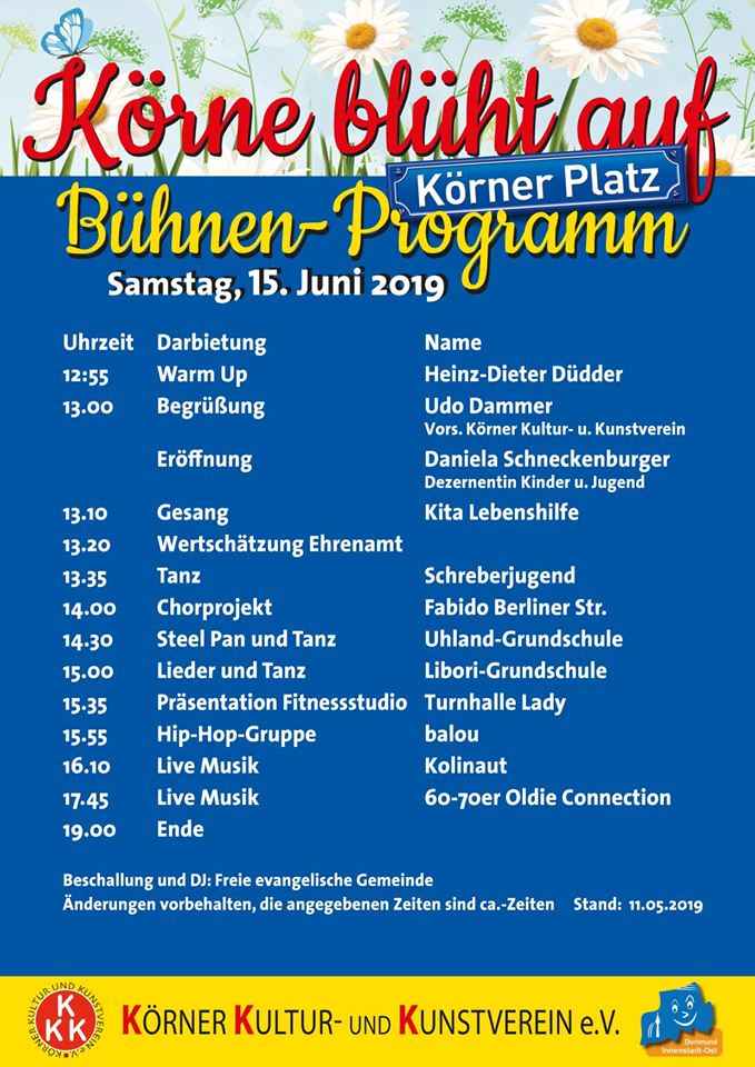 Um 13.00 Uhr wird die Veranstaltung durch Daniela Schneckenburger, Dezernentin des Kinder- und Jugendbereiches der Stadt Dortmund eröffnet. Das Projektteam um Heinz-Dieter Düdder (2. Vorsitzender des Körner Kultur- und Kunstvereins) und Stephanie Wetzold-Schubert präsentiert eine abwechslungsreiche Veranstaltung mit 50 Teilnehmern und 40 Ständen.