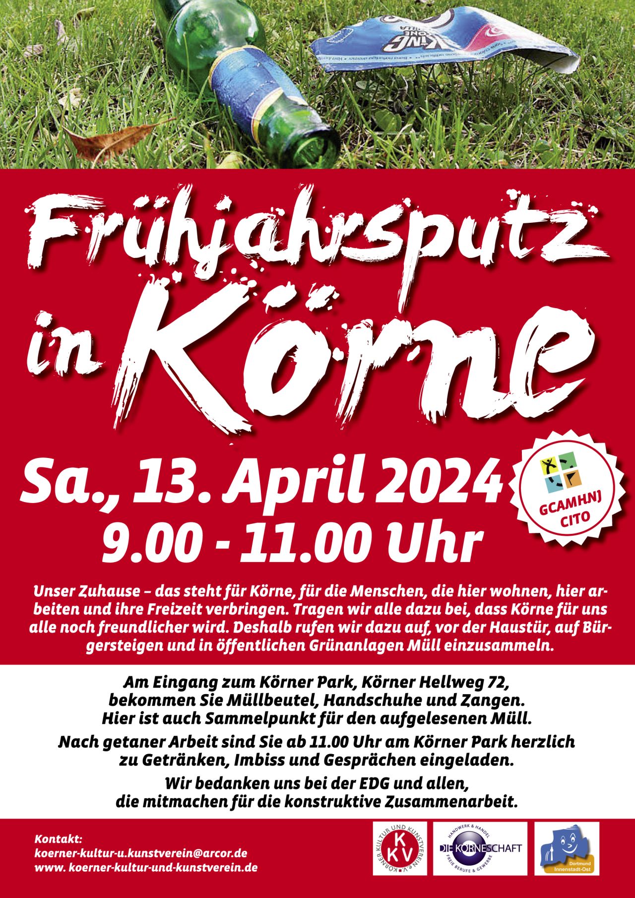 Zum jährlichen Frühjahrsputz laden der Körner Kultur- und Kunstverein (KKV) und die Körneschaft für den 13.04. ein. „Mit der jährlichen Müllsammelaktion vor unserer Haustür möchten wir ein Zeichen setzen für ein sauberes Körne“ so Heinz-Dieter Düdder, 2. Vorsitzender im KKV.