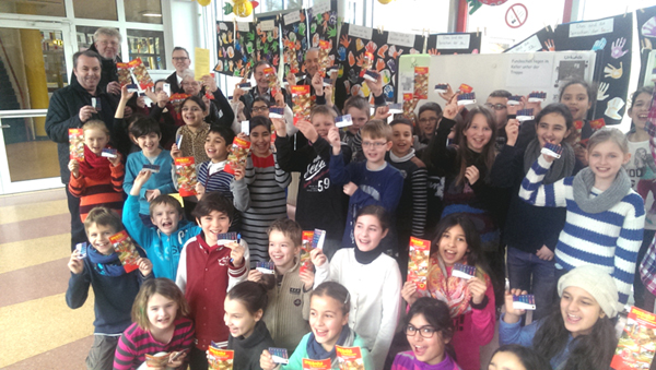 Zusammen mit ihrem Schulleiter Herrn Ant konnten die Mitglieder der Bezirksvertretung Innenstadt-Ost die beliebten Jahreskarten an die Kinder übergeben.