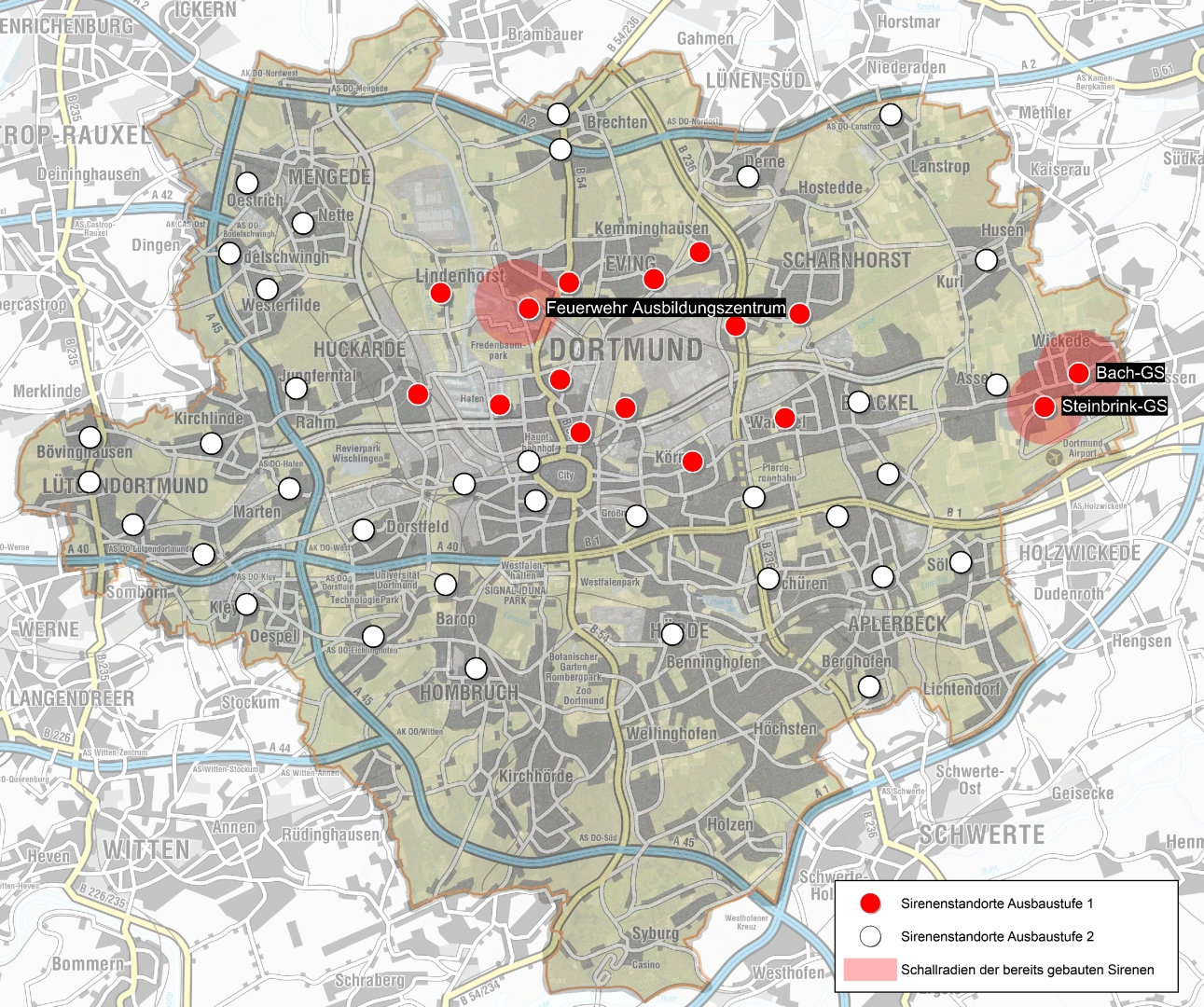 Derzeit wird in Dortmund an der Errichtung eines modernen Sirenennetzes gearbeitet. Für die Abdeckung des gesamten Stadtgebiets sind vier Ausbaustufen vorgesehen, von denen der Rat der Stadt Dortmund bereits zwei beschlossen hat. Die erste Ausbaustufe umfasst 16 Standorte, die zweite Ausbaustufe 35. Aktuell sind drei Sirenen an den in der Anlage beschriebenen Standorten in Betrieb.