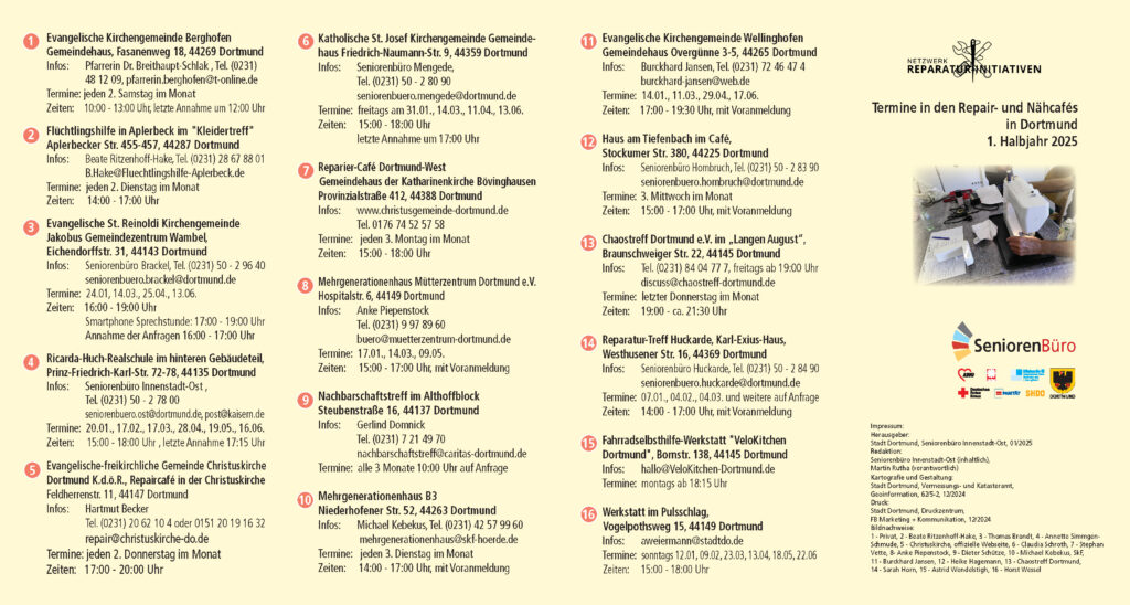 Zwei neue Angebote beinhaltet der Flyer „Termine in den Repair- und Nähcafés in Dortmund 1. Halbjahr 2025“, der unter der Trägerschaft der Seniorenbüros Dortmund halbjährig herausgebracht wird. In der „Werkstatt am Pulsschlag“ in Dorstfeld (Vogelpothsweg 15) können Interessierte defekte Gegenstände zur Reparatur bringen. Einmal im Monat, immer sonntags von 15:00 bis 18:00 Uhr, sind handwerklich geschickte Ehrenamtliche dort vor Ort anzutreffen. Der nächste Termin ist der 9. Februar.