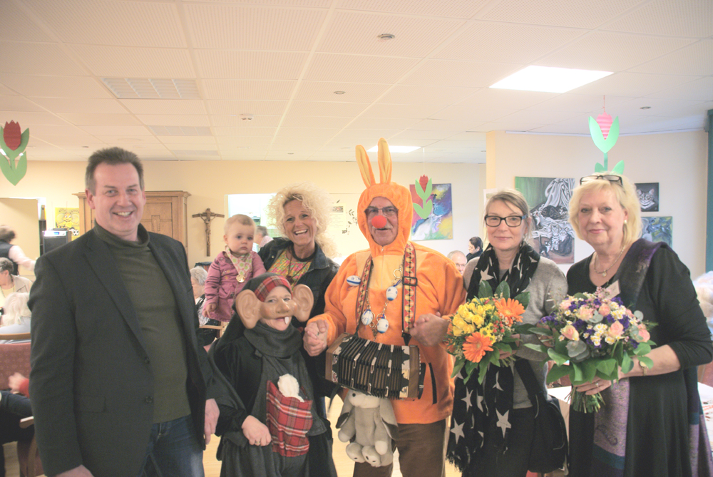 Auch der Osterhase war zu Gast im Josefinenstift: v. l. n. r. Thorsten Hoffmann (CDU), Heike Deimann (Heimleitung), der Osterhase, sowie die Künstlerinnen Bettina Köppeler und Dagmar Schnecke-Bend.