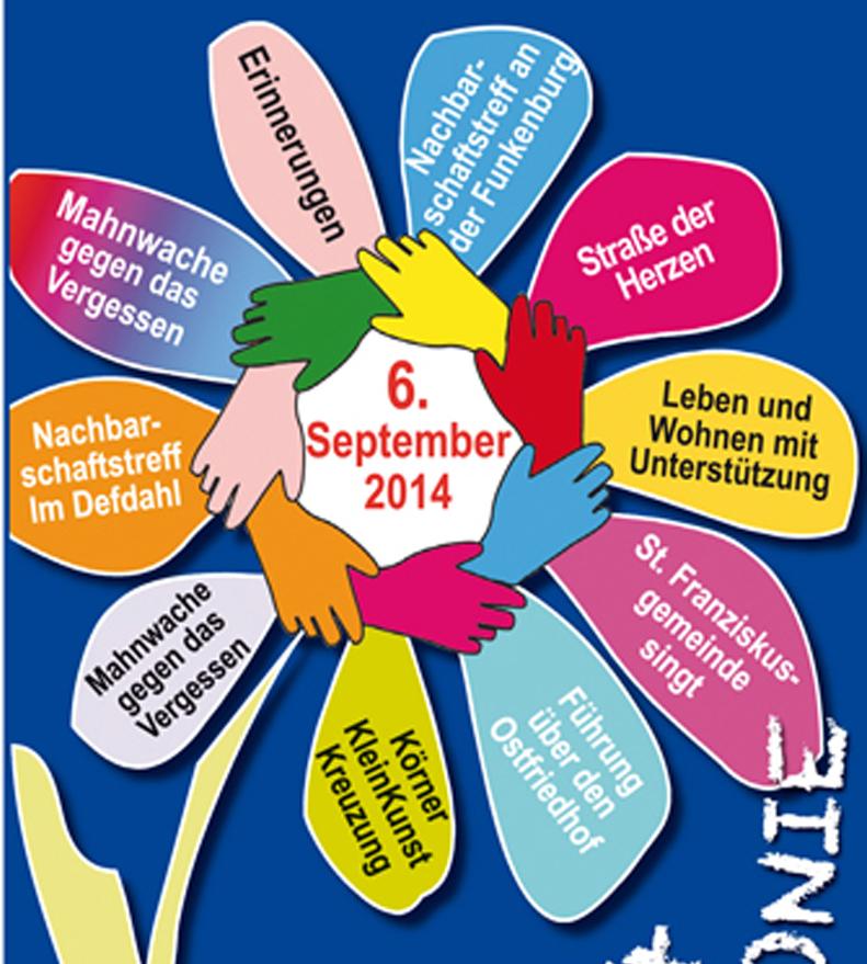 Im sechsten Jahr werden Kaiserstraßenviertel und Körne am 6.9. – dem Samstag nach dem Antikriegstag- gemeinsam feiern und damit ein harmonisches Miteinander präsentieren. Mit Koordination des Stadtbezirksmarketings Innenstadt-Ost hat ein breites gesellschaftliches Bündnis 9 Veranstaltungen vorbereitet. „Ein harmonisches Miteinander aller Generationen und Kulturen“ versprechen Udo Dammer (Bezirksbürgermeister Innenstadt-Ost) und Heinz-Dieter Düdder von der Lenkungsrunde Stadtbezirksmarketing Innenstadt-Ost. Erstmals zeigen mit Bündnis90/Die Grünen, Die Linke, FDP und SPD vier demokratische Parteien gemeinsam Flagge für Vielfalt, Toleranz und Demokratie.