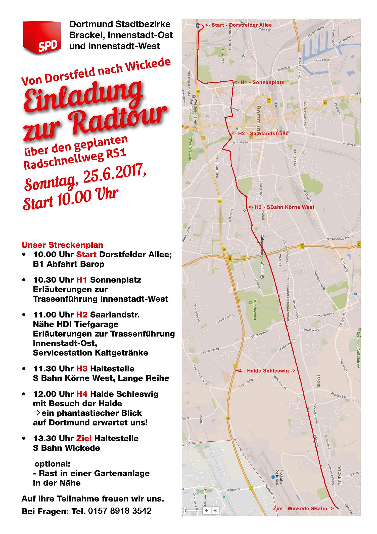 Die SPD in Brackel, Innenstadt-Ost und Innenstadt-West lädt die Bevölkerung zu einer Radtour über die geplante Trasse des Radschnellweges RS1 am Sonntag, den 25.06.17 ein.
