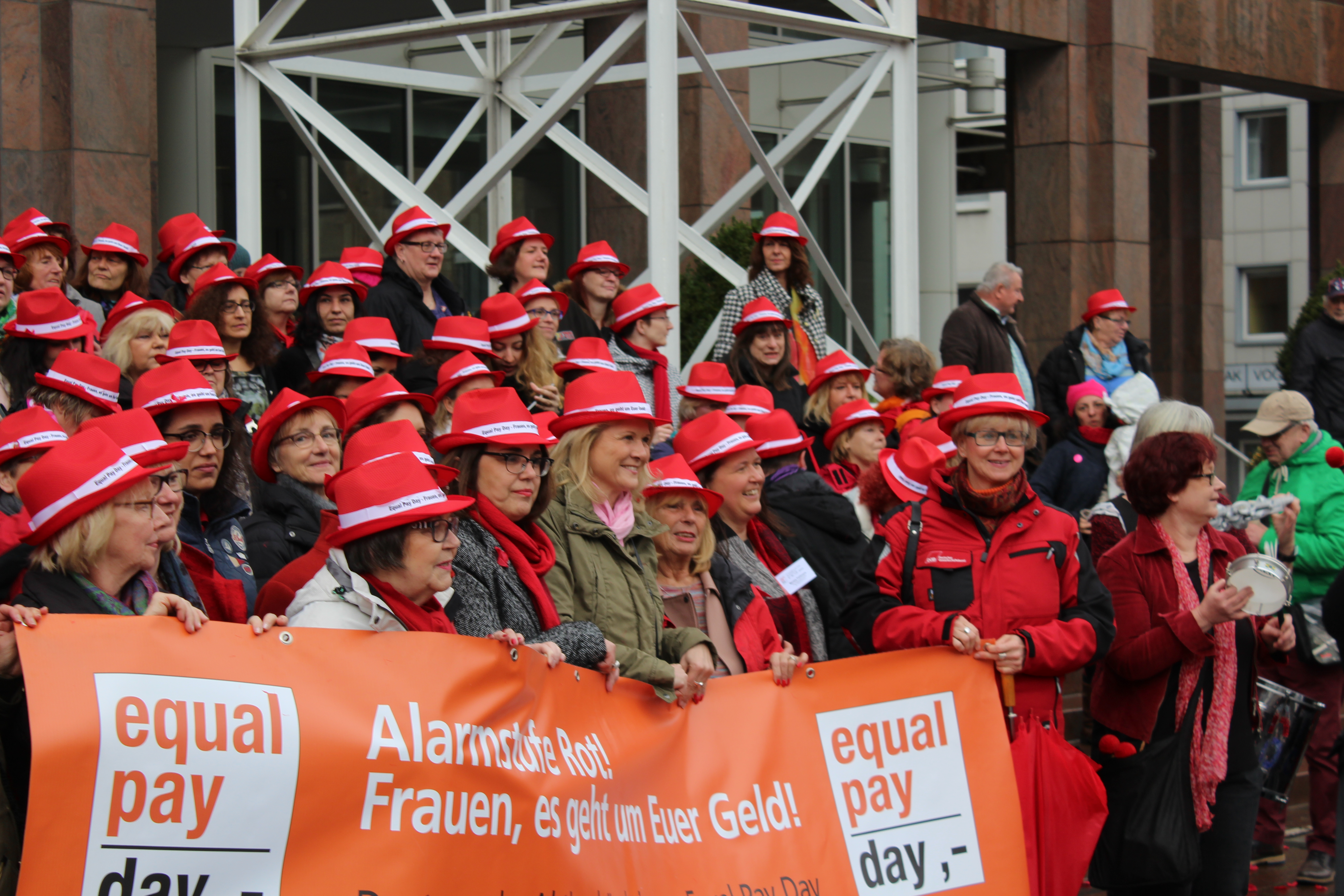 Der gemeinsame Marsch durch die Stadt startet um 15.30 Uhr am Rathaus. Ausgestattet mit roten Hüten und angeführt von der Samba-Gruppe Atè Logo führt der Protestmarsch für mehr Lohngerechtigkeit zu den Katharinentreppen, wo das Aktionsbündnis eine besondere Überraschungsaktion geplant hat. Nach dem Rückweg zum Rathaus wird der Friedensplatz durch viele Konfetti-Kanonen in Rot getaucht – die Signalfarbe des Tages.