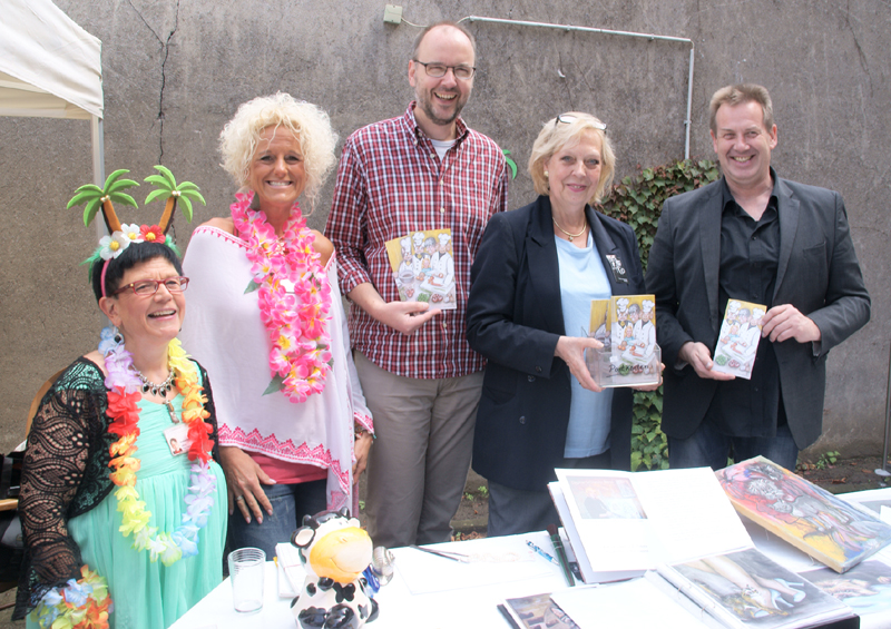 Der Erlös aus dem Verkauf der beiden Postkarten geht an die Dortmunder Tafel für Kinder, v. l. n. r. Dorothee Peter und Heike Deimann vom St. Josefinenstift, Ansgar Wortmann von der Dortmunder Tafel, Künstlerin Dagmar Schnecke-Bend und Bundestagsabgeordneter Thorsten Hoffmann (CDU) (Foto: Rüdiger Beck)