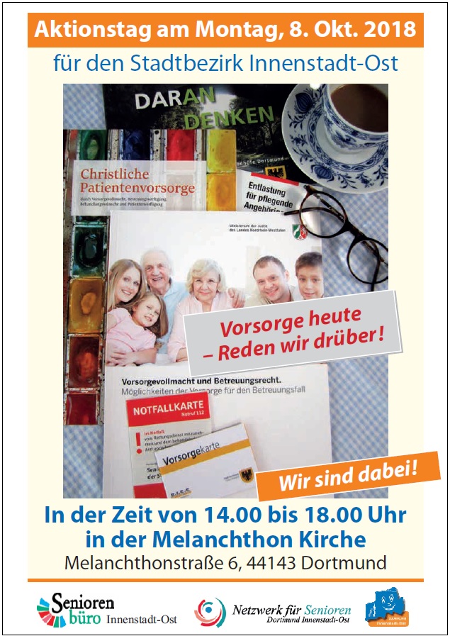 „Vorsorge heute – Reden wir drüber!“. Unter diesem Motto steht der Aktionstag am 08. Oktober 2018 für den Stadtbezirk Innenstadt-Ost. Die Beratungsanfragen rund um das Thema Vorsorge steigen stetig an. Immer mehr junge Seniorinnen und Senioren setzen sich mittlerweile damit auseinander. „Entmündigung“ war lange der Begriff der vermeintlich mit Vorsorgevollmachten oder Betreuungsverfügungen in Verbindung gebracht wurde. Doch das ist schon […]