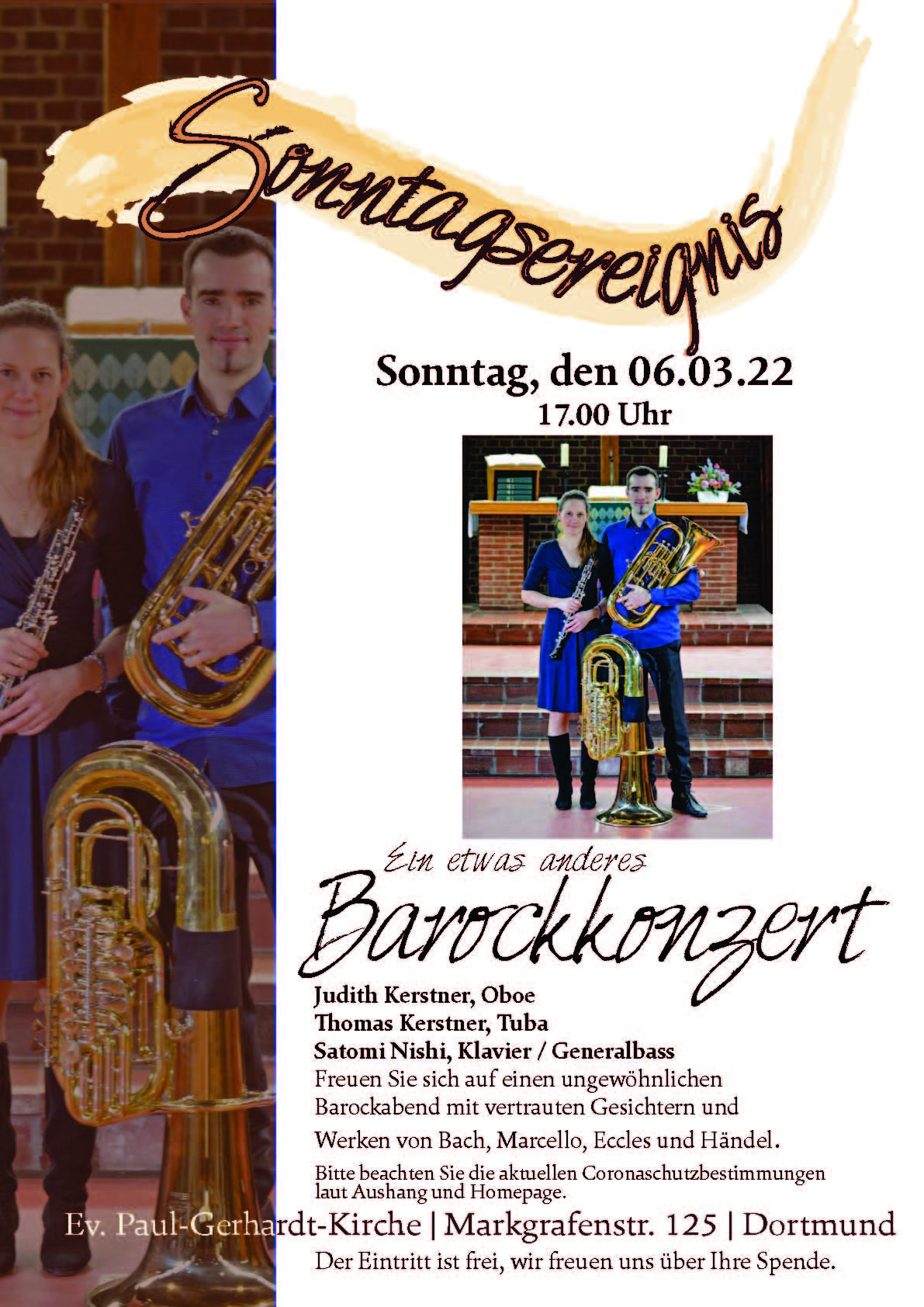 Unter dem Motto „Musikalische Kostbarkeiten“ steht am 09.03.2025 um 17.00 Uhr das Sonntagsereignis in der Paul-Gerhardt-Kirchengemeinde, Markgrafenstr. 125. Präsentiert werden Werke von Antonio Vivaldi, Georg Philipp Telemann, Georg Friedrich Händel, Jean-Marie Leclair, Violeta Dinescu und Grete von Zieritz. Das bereits seit vielen Jahren miteinander musizierende Duo Boettcher/Lausberg stellt leidenschaftlich gern Werke unterschiedlicher Epochen einander gegenüber, diesmal aus Barock und Moderne. […]