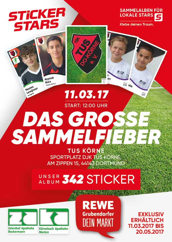 Für viele Dortmunder Fußballfans geht am 11.03.2017 um 12.00 Uhr ein Kindheitstraum in Erfüllung. Der DJK TuS Körne stellt in seinem Vereinsheim an der Sportanlage „Am Zippen 15“ das neue Stickeralbum vor.
