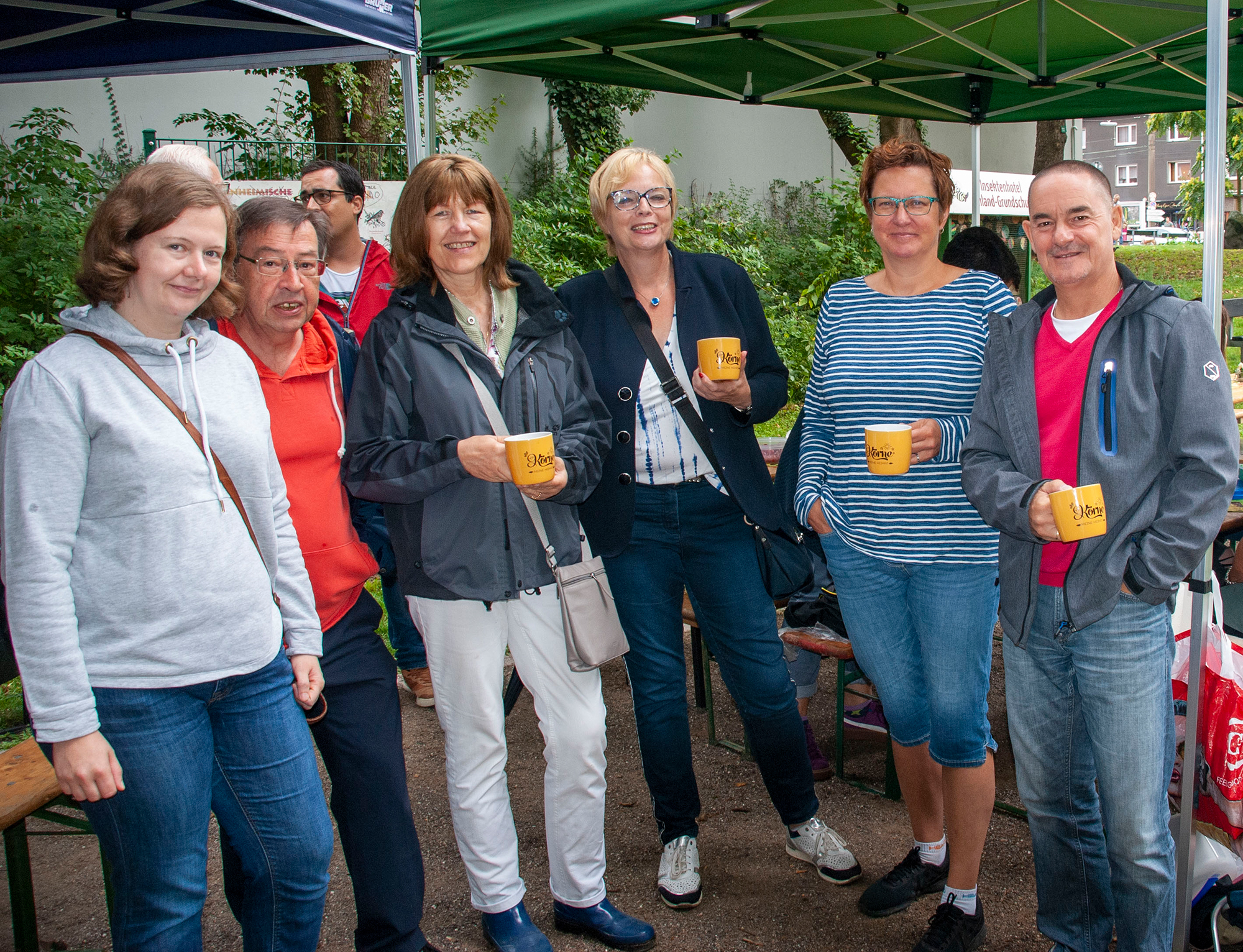 Einladend geschmückte Tische und Bänke wurden kurzerhand mit Pavillons vor den Regentropfen abgeschirmt. So traf man sich bei angenehmer Musik und guter Laune, um das mitgebrachte Essen und die Getränke zu teilen und gemeinsam zu verzehren.